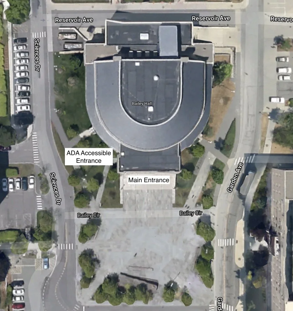 Patrons with limited mobility may gain access to Bailey Hall through the entrance to the lower lobby at the southwest corner of the building (to the left of the main doors as you face Bailey Hall from the plaza).